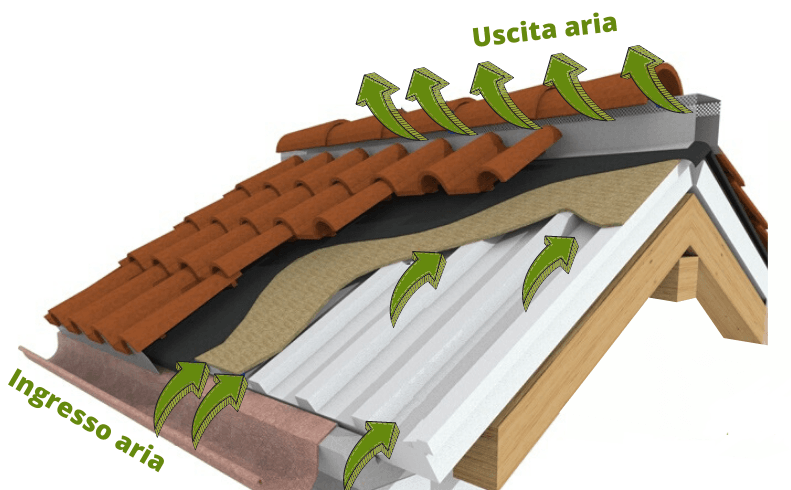Tetti ventilati: creano un'intercapedine d'aria sotto il manto di copertura, fondamentale per la traspirazione e l'isolamento termico, riducendo l'umidità e mantenendo gli ambienti più freschi d'estate.